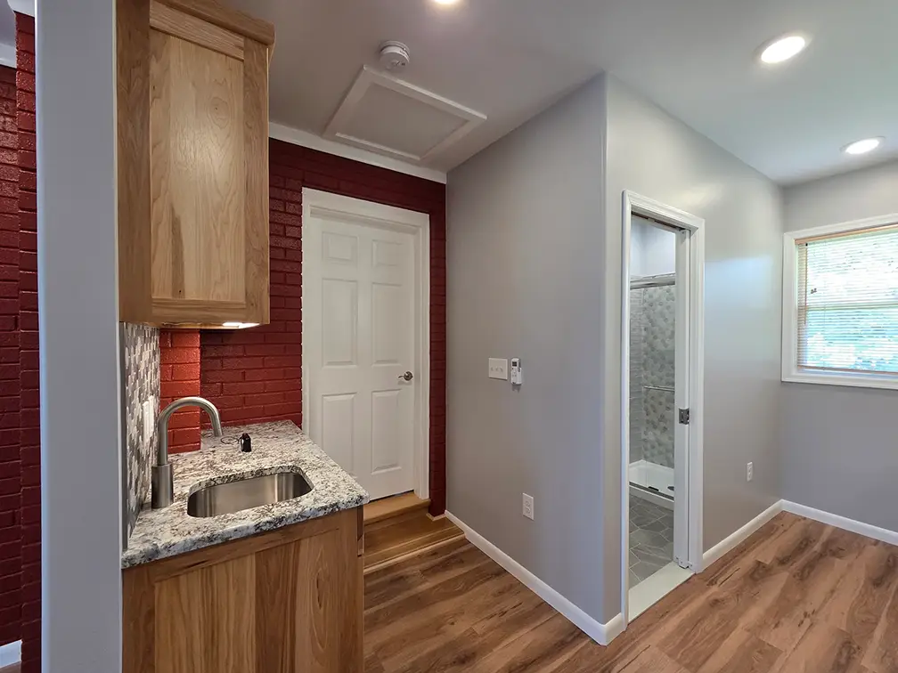 From there, we installed high-efficiency insulation, full electric and plumbing rough-ins for the kitchenette and bathroom, and laid out recessed lighting and receptacles to support everyday living. The new high-efficiency mini-split system keeps the studio comfortable through all four Mid-Atlantic seasons.