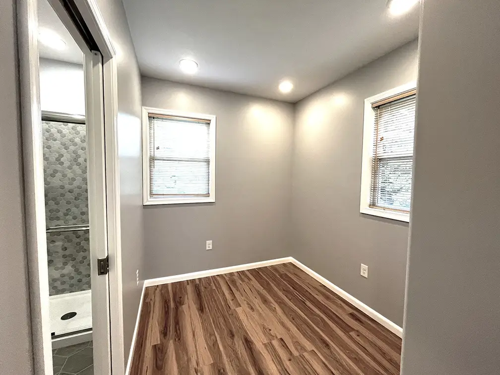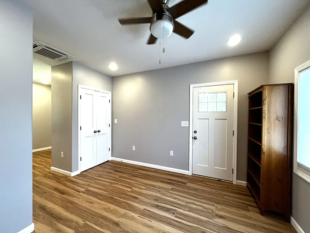 Once the space was ready, Harmon Builders stepped in to help give the apartment purpose. After asbestos specialists removed the original ceiling and installed new drywall, we framed a brand-new front wall with a secure footer where the garage door once stood. Two new vinyl windows facing west now open the space to the outside and transform the former garage into a light-filled living room.