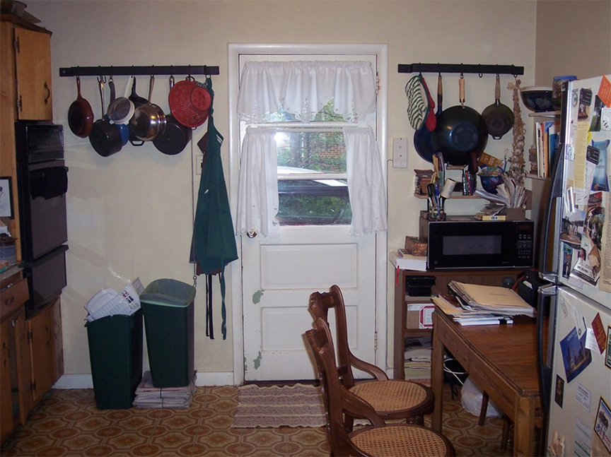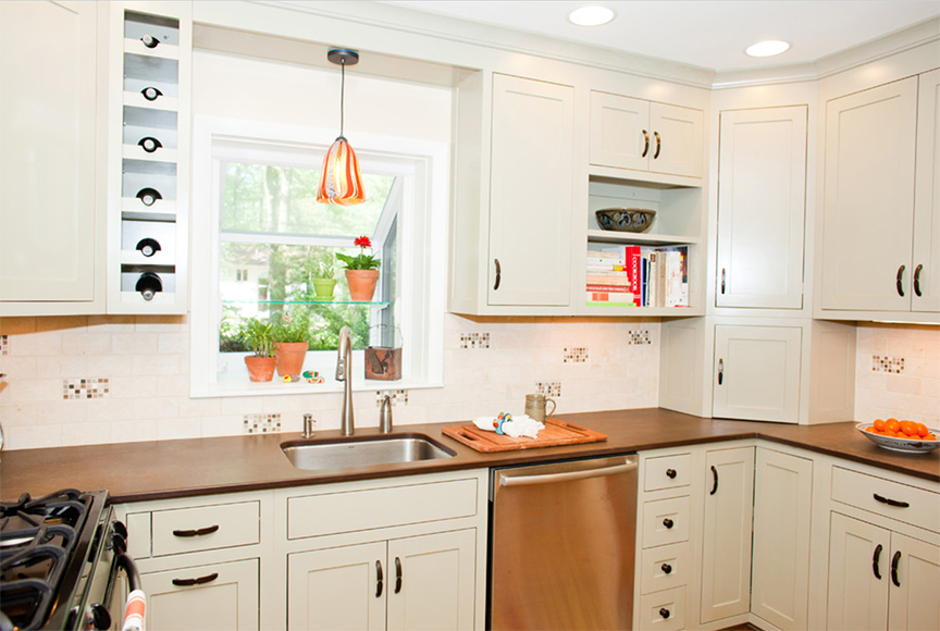 A 1950s split-level needed some refinement, so the modest-size kitchen was redesigned to allow more task space and storage with custom cabinetry and dedicated cubbies for stowing small kitchen appliances, brooms, dustpans, and the like. The owner selected an elegant Shaker-style door and drawer profile. All cabinetry in this project was built by craftsmen Paul Harmon and Jason Airing. Designer: Meredith Ericksen with Tuscan Blue Design.