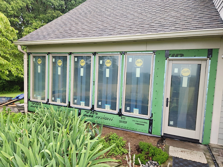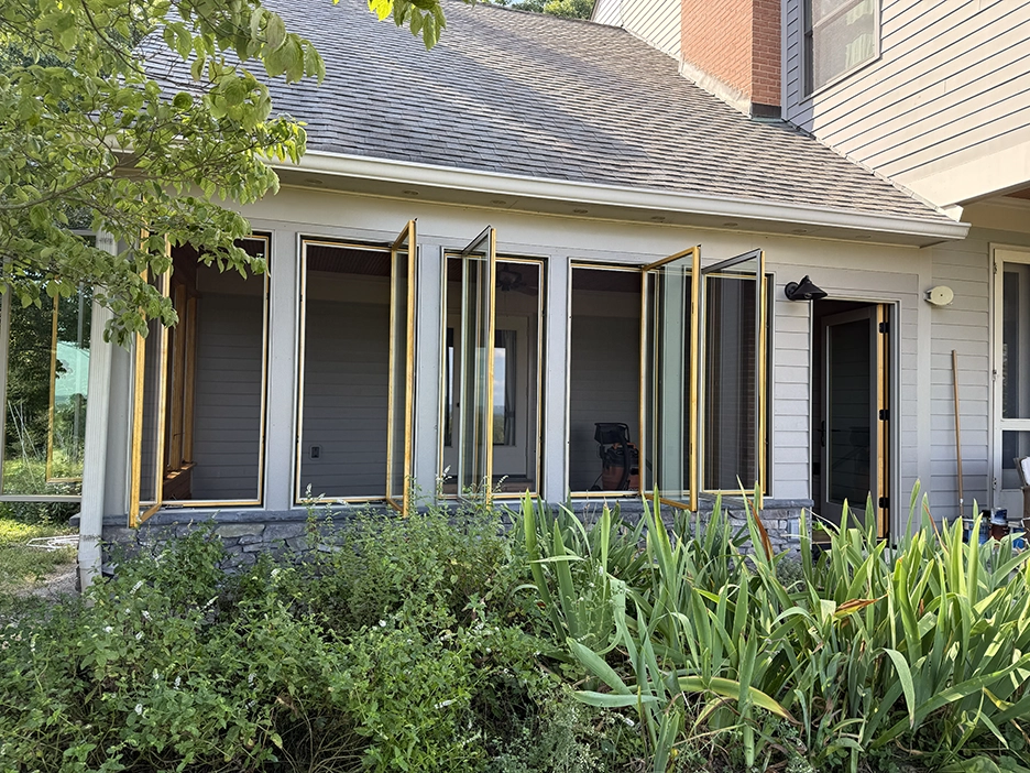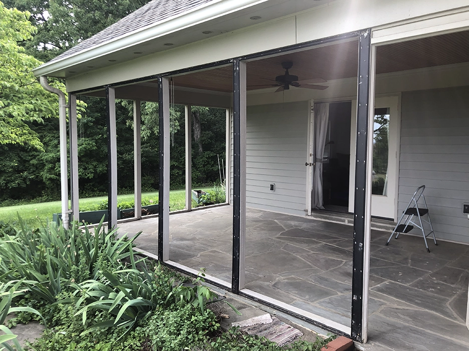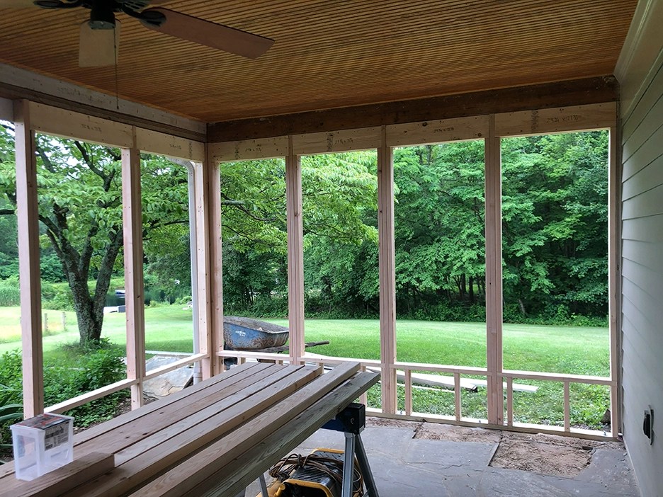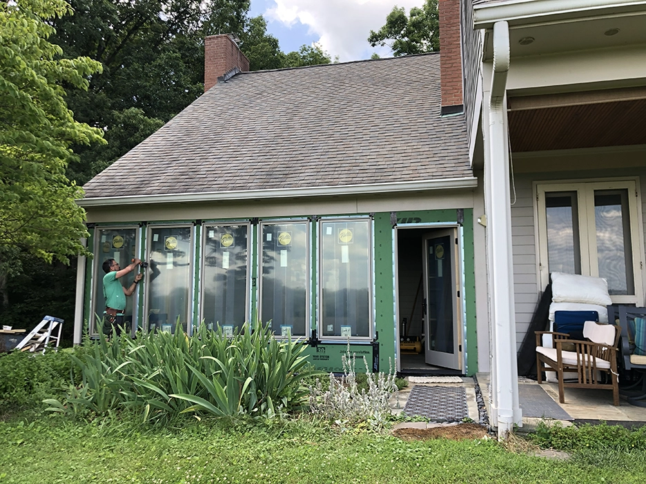 This late-summer project marks another rewarding collaboration with longtime clients who have entrusted Harmon Builders with a variety of improvements to their home over the years (e.g., a pool enclosure/pool room, a farm-to-table kitchen, and Butler’s Pantry Cabinetry). Paul Harmon and sons, Jesse and Emerson, transformed an underused exterior porch into a fully enclosed, conditioned sunroom designed for year-round comfort.