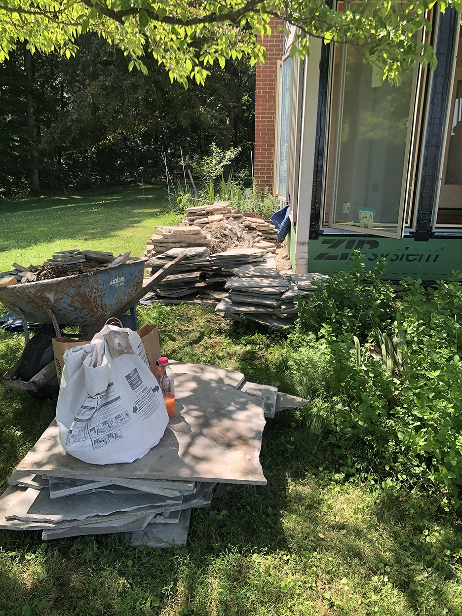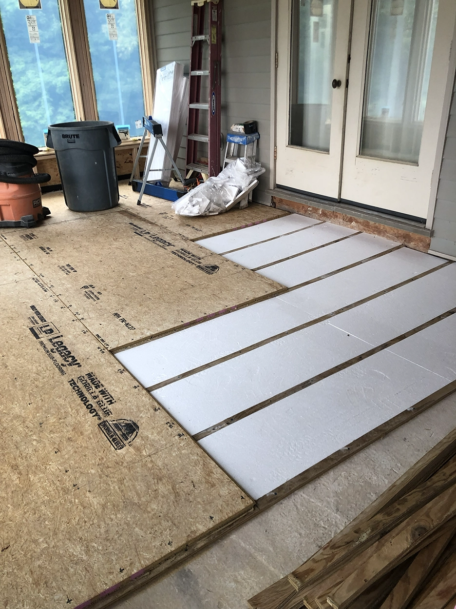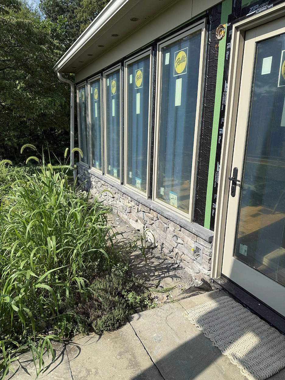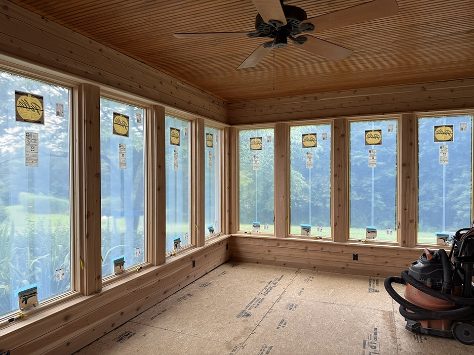 The team started by carefully removing the original screen structure and flagstone flooring, which stones were thoughtfully repurposed to protect a walkway elsewhere on the property—supporting the owners’ sustainability goals. All new interior and exterior electrical wiring and outlets were installed to meet current code standards, followed by a new structural, insulated subfloor engineered to support the upgraded finish materials and provide R-value for colder winter temperatures and hot summer months. New veneer ledgestone by Nitterouse Stone was applied to the exterior bottom “skirt” of the sunroom to closely match the masonry on the existing home.