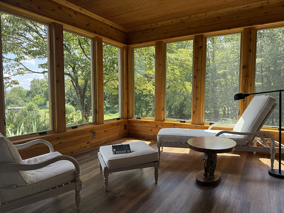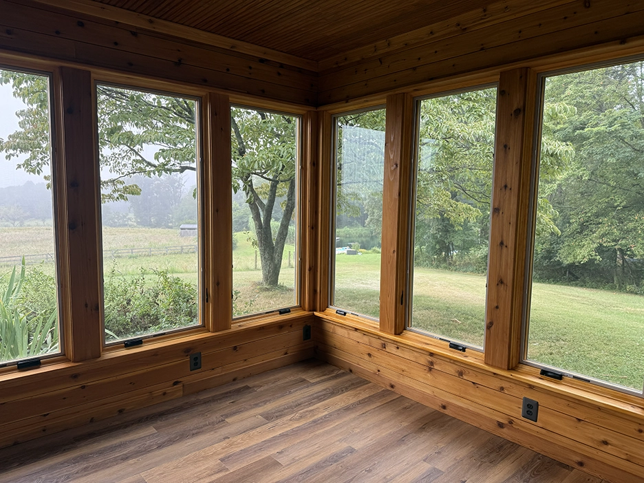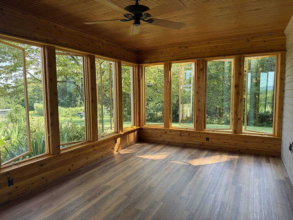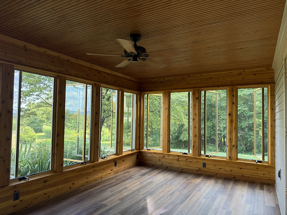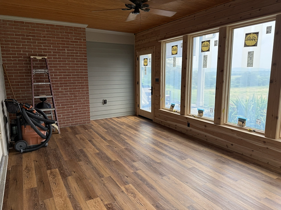 To maintain continuity with other renovated spaces in the home, Mannington Luxury Vinyl Plank flooring was selected for its durability, insulation, and ease of maintenance—an ideal choice for clients planning to age in place. Paul and his sons installed new Pella casement windows throughout, allowing ample natural light, cross-breezes, and panoramic views of the owners’ cattle pasture, South Mountain, and the rolling hills of Middletown Valley.